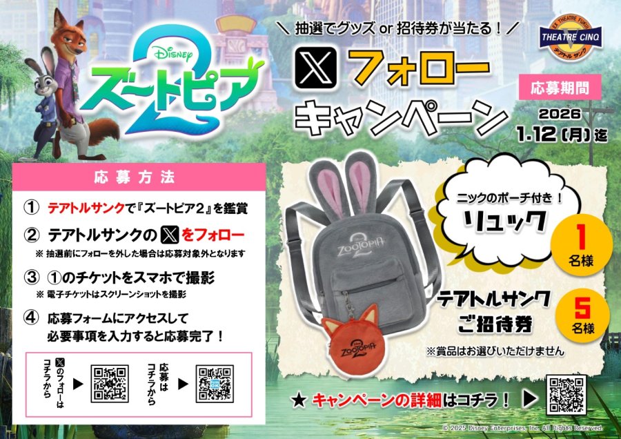 12.5(金)~『ズートピア2』公開記念!Xフォローキャンペーン【テアトルサンク公式X】