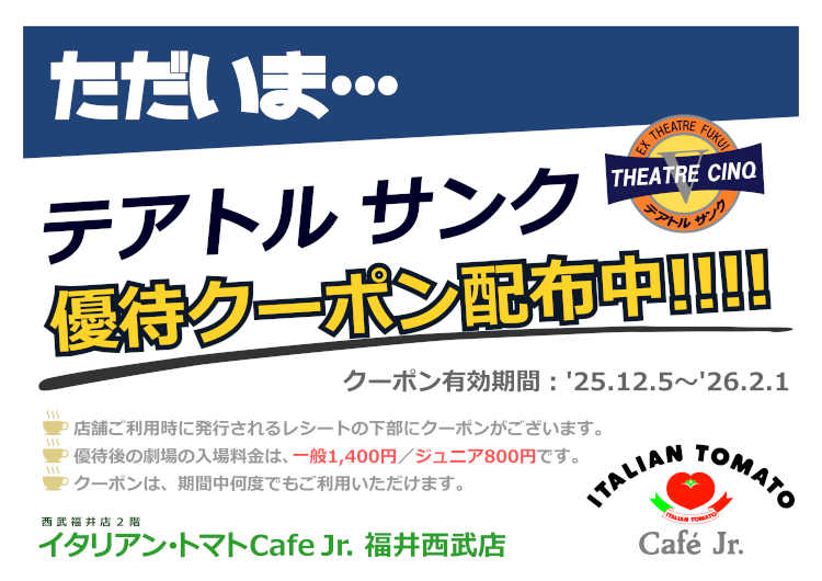 西武福井店2F イタリアントマトCafe Jr. にて好評実施中のテアトルサンクの半券サービスが、西武8Fダイニングスクエアの全店舗に拡大しました!映画を楽しんだ後は、おいしい時間をいかがでしょうか。