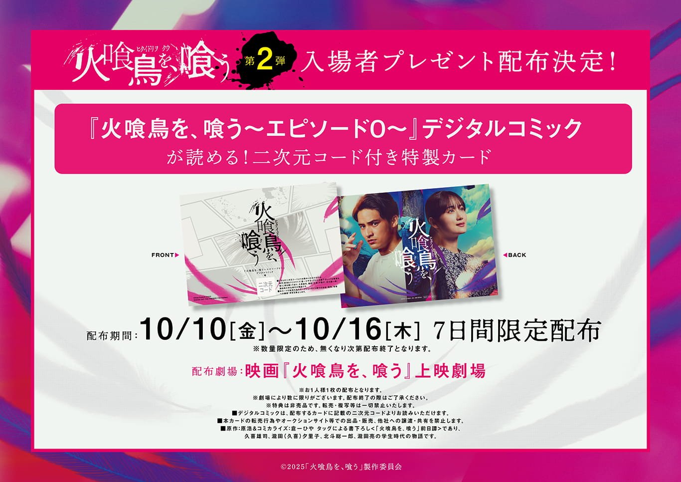 10月10日(金)から7日間限定で、入場者プレゼント「『火喰鳥を、喰う~エピソード0~』デジタルコミックが読める!二次元コード付き特製カード」の配布が決定いたしました!