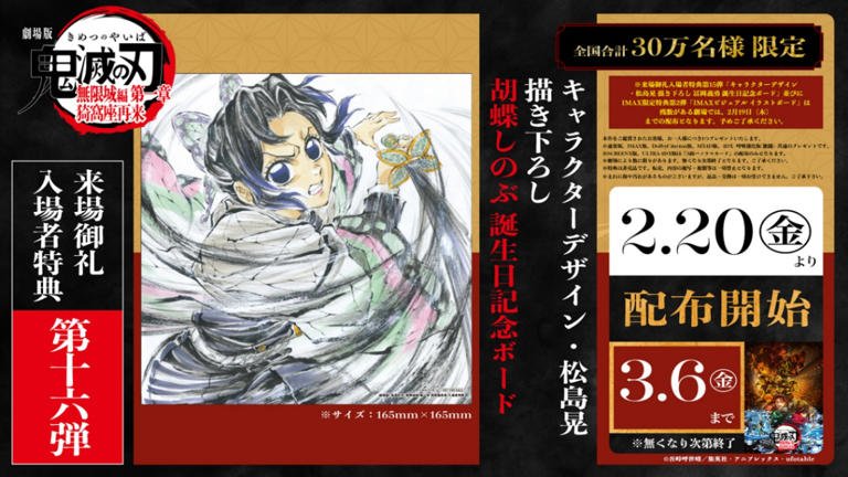 ※来場御礼入場者特典第15弾「キャラクターデザイン・松島晃 描き下ろし 冨岡義勇 誕生日記念ボード」、並びにIMAX限定特典第2弾「IMAXビジュアル イラストボード」に関して、残数がある劇場においては、2月19日(木)までの配布となります。予めご了承ください。